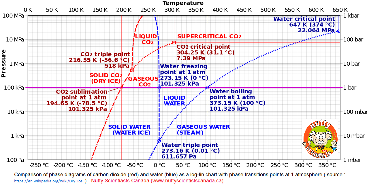 Find attachment : Comparison of phase diagrams of carbon dioxide (red) and water (blue) as a log-lin chart with pressure from 100 Pa to 100 MPa and temperature from 0 K to 650 K, compiled from data in