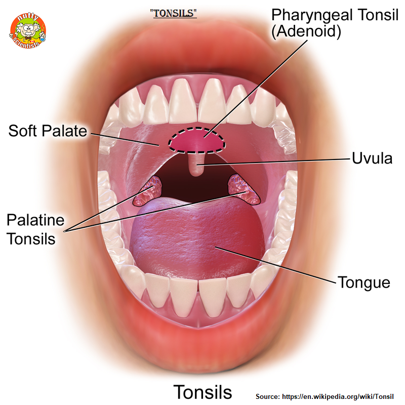 The tonsils (palatine tonsils) are a pair of soft tissue masses located at the rear of the throat (pharynx). Each tonsil is composed of tissue similar to lymph nodes, covered by pink mucosa (like on the adjacent mouth lining). Running through the mucosa of each tonsil are pits, called crypts.