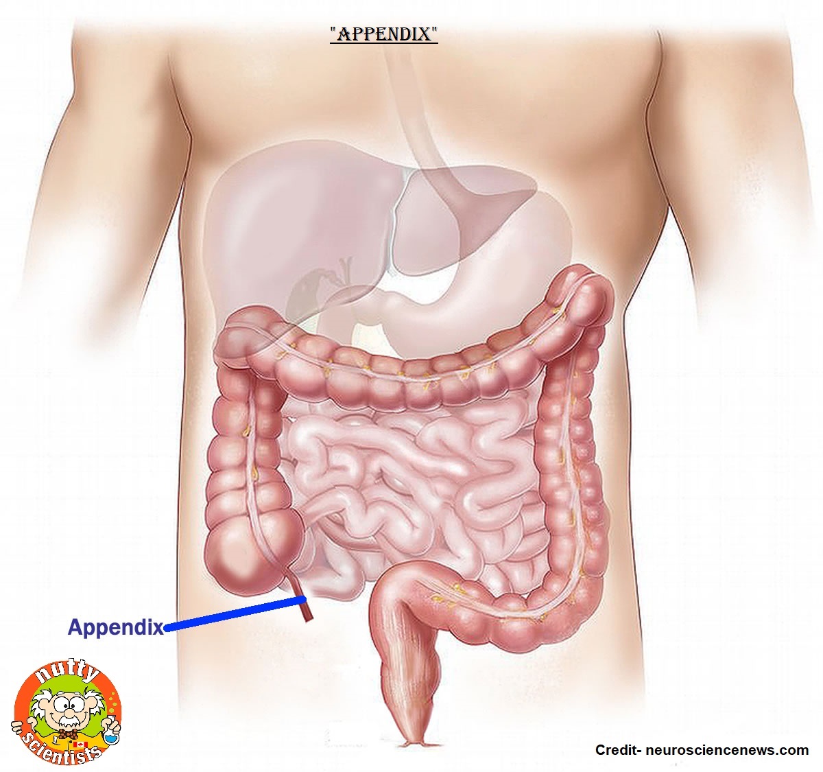 The appendix is a small, pouch-like sac of tissue that is located in the first part of the colon (cecum) in the lower- right abdomen. Lymphatic tissue in the appendix aids in immune function. The official name of the appendix is veriform appendix, which means "worm-like appendage."