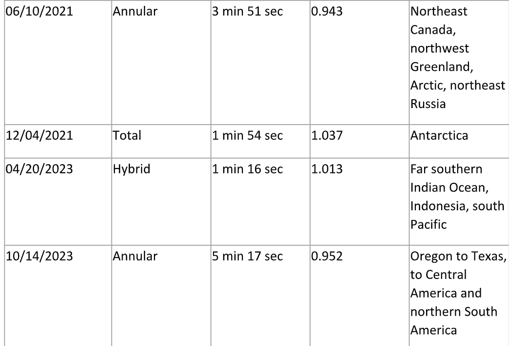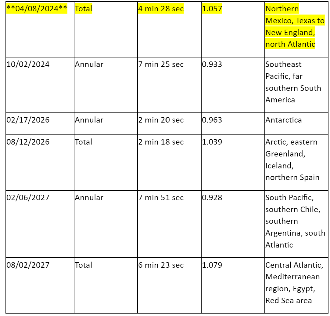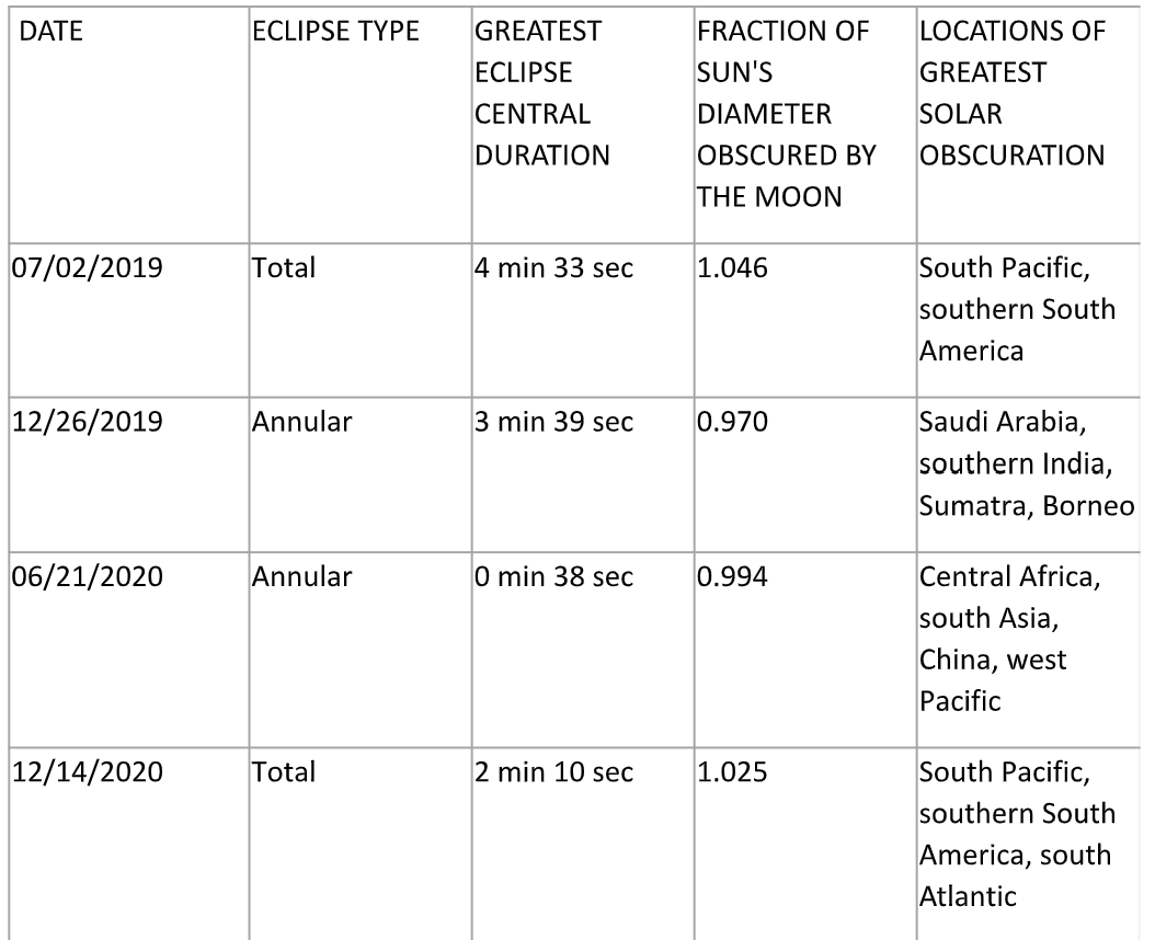 DATES OF UPCOMING TOTAL AND ANNULAR SOLAR ECLIPSES AND LOCATIONS FOR BEST VIEWING:
